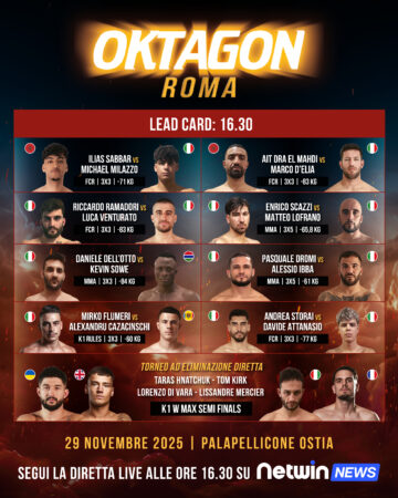 (di Valerio Vulpis) – Si avvicina l’evento dell’anno nel settore degli sport da combattimento. Parliamo di “Oktagon Roma” in programma al Pala Pellicone di Ostia (centro tecnico federale della FIJLKAM) il prossimo sabato 29 novembre. La kermesse lidense è strutturata in due parti: la prima (lead card) prevede 10 match