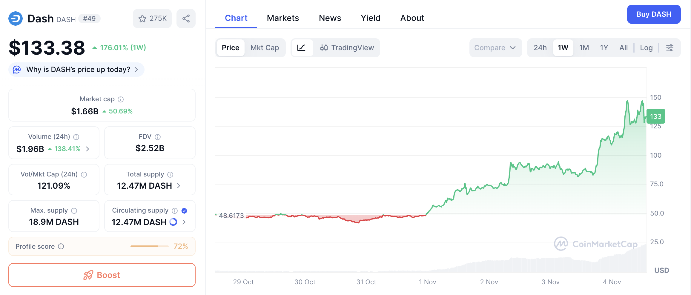 Il prezzo di Dash ha appena messo a segno uno dei rally più violenti e improvvisi degli ultimi anni, registrando un rialzo del 50% nelle ultime 24 ore e un incredibile +176% su base settimanale. Questa impennata ha colto di sorpresa il mercato, portando la capitalizzazione di Dash a oltre 1,9 miliardi di dollari e spingendo il prezzo di $DASH sopra i 1330 dollari.