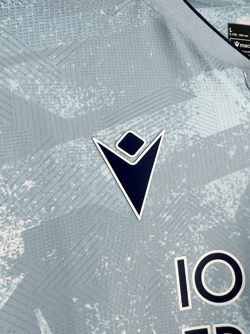 La seconda maglia dell’Udinese Calcio si distingue per il collo alla coreana, impreziosito da dettagli in blu navy e rosso che richiamano i bordi manica. Il colore principale è un elegante blu avio chiaro, arricchito da una grafica sublimata astratta: un motivo composto da figure geometriche irregolari e sfumate in bianco e azzurro, che si estende sia sul fronte sia sul retro della maglia e si ispira allo stile delle maglie anni ’90.