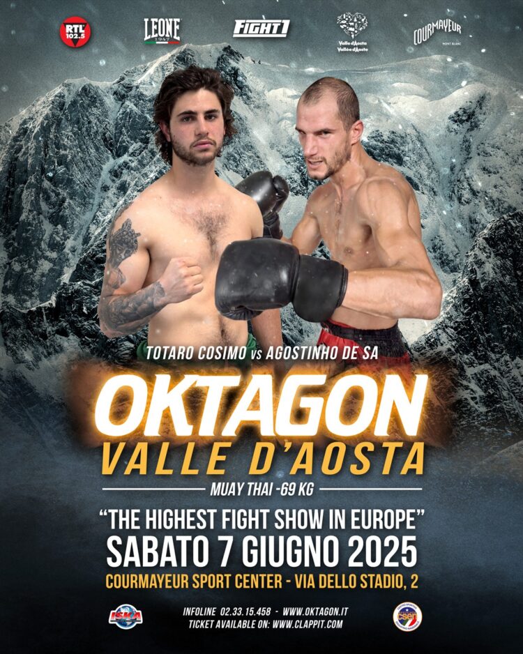 Cosimo Totaro è un giovane prospekt che si è fatto notare alla coppa Italia di Muay Thai alcuni mesi fa a Pisa. Molto spettacolare e soprattutto grintosissimo, ha impressionato tutti a Pisa quando ha chiuso l’avversario in una morsa per poi martellarlo di gomitate e ginocchiate. “Una vera fighting machine” ci ha detto il presidente di Fight1 Carlo Di Blasi quando, a fine evento, lo ha subito ingaggiato per OKTAGON Valle D’Aosta.