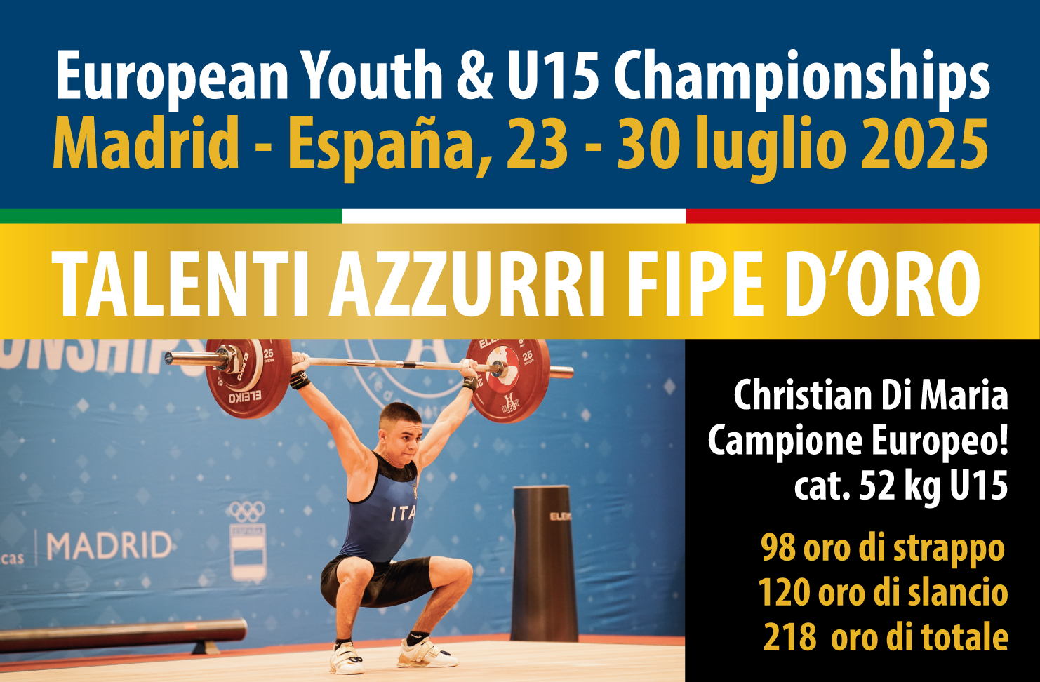 Christian Di Maria conquista, per la seconda volta consecutiva, il titolo di Campione Europeo Under 15, e sale sul gradino più alto del podio continentale a Madrid. L’azzurrino si mette al collo tre medaglie d’oro, e firma anche due nuovi record italiani, di slancio e totale. Per lui 98 kg di strappo, 120 kg di slancio, per un totale di 218 kg, una misura che stacca in maniera evidente i suoi diretti avversari e rivela la grande levatura dell’atleta azzurro. 177 i kg sollevati nel totale, infatti, dal bulgaro Aliyanov a cui è andato l’argento mentre il bronzo è andato al georgiano Kutchava con 174 kg.