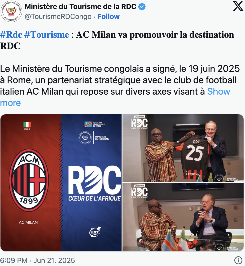L’operazione era stata annunciata già nel settembre 2024, poi l’ufficialità nell’estate di quest’anno, con il supporto del top manager rossonero Paolo Scaroni (presidente del club e dell’ENI – nella foto in primo piano sul profilo “X” del Ministero del Turismo del Congo) e soprattutto della Farnesina (per opera proprio del ministro e vicepresidente del Consiglio Antonio Tajani). Tra le iniziative che si intende sviluppare congiuntamente c’è quella della nascita di Academy calcistiche in Africa e tournée di lusso per promuovere il football professionistico in Congo (stato dell’Africa centrale che conta più di 105 milioni di abitanti).