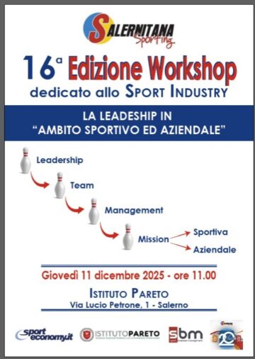 La 16ima edizione del workshop organizzato da Salernitana Sporting , dal titolo “La leadership nell’ambito sportivo e aziendale”, si terrà giovedi 11 dicembre ore 11:00 presso l’istituto scolastico Pareto di Salerno. L’obiettivo fondamentale del workshop , è la creazione di un “progetto sportivo vincente”, che possa diffondere la cultura aziendale